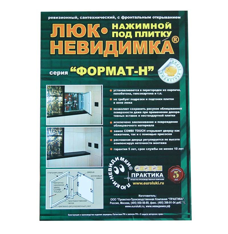 Настоящие профессионалы давно оценили качество стальных люков под плитку от компании Практика. Люк Формат КН 30x50 это проверенная надежность, легкость открытия, долговечность. Магнитно-нажимной замок CombiTOUCH® лучший из множества вариантов защелок. Конструкция петли простая, но практичная и без лишних регулировок. Работает без нареканий. Мастера рекомендуют!