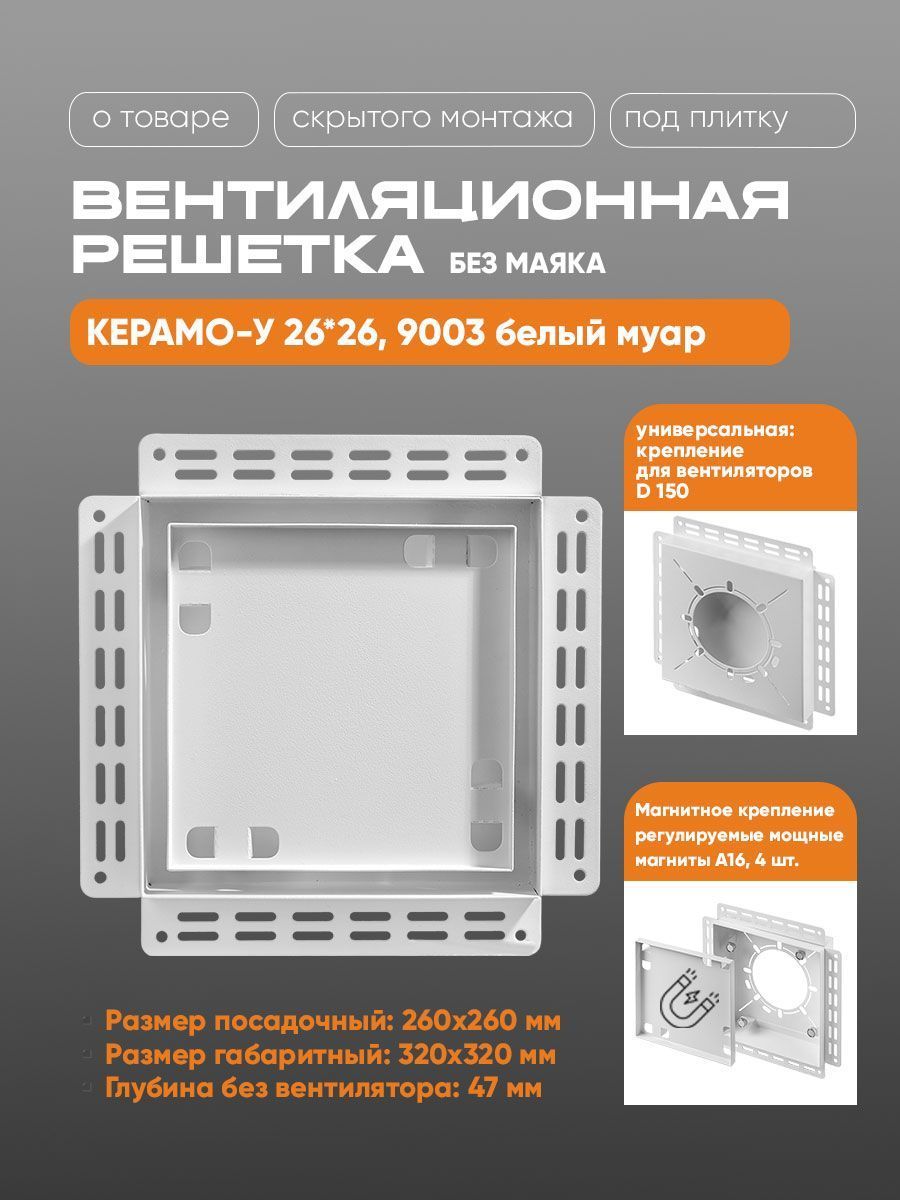 Решетка вентиляционная скрытого монтажа "Вентайл Керамо-У" под плитку без маяков, монтажный размер 260*260 (h) мм, габаритный размер 320*320 (h) мм, универсальное крепление для вентиляторов D150, подходит практически любой вытяжной вентилятор(приобретается отдельно!) Поможем подобрать при необходимости.